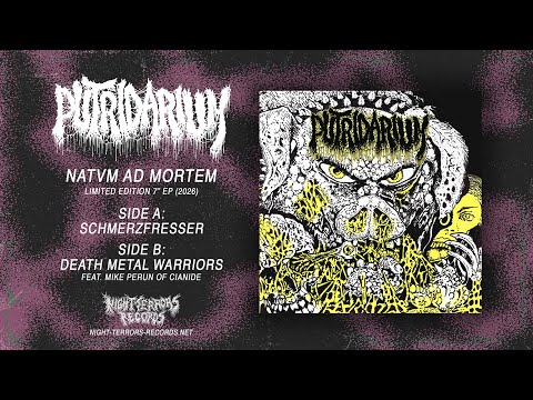 "Death Metal Warriors," the "b-side," is by far the sturdier song. Mike Perun (vocalist-bassist of Cianide, a band of similar styles) is featured on vocals, adding another layer of depth to the track. The vocals, both Mike's and Giona's, are mournful, gurgly, and perfectly fitting to provide the old-school death doom sound. "Schmerzfresser," pain flexor in English, leans further into basic death metal, but it's still a solid song. The trouble I'm having with this record isn't the music, it's frustration at the amount of it. Putridarium clearly can play solid music, and they've produced full-length records in the past, so why settle for two songs and call it a day? My theories suggest it's simply easier, as there's enough material to be put on vinyl and sold. I say the band should disregard "NATVM AD MORTEM" and focus on collective enough goodness to pur forth a proper, meaty release. There's hope for Putridarium.